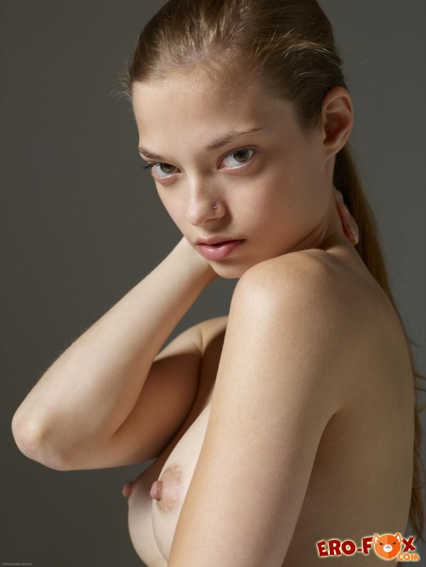 Привлекательная молодая модель с большими глазками, кувыркаясь на полу, демонстрирует худощавое, но в то же время весьма сексуальное голое тело. Наслаждаясь процессом съёмки, девушка особенно охотливо показывала упругие дойки с торчащими сосками и бритую письку, обхватывая при этом талию нежными руками.