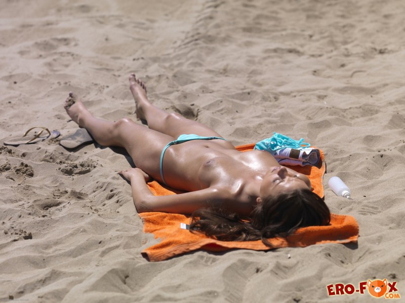 Устроившись на общественно пляже в отдалении от толпы людей, привлекательная нудистка, в одних только трусиках, загорает на полотенце под солнцем и параллельно демонстрирует сексуальное тело с небольшими сиськами. Вскоре молодая худенькая девушка все же разделась до гола и так же продемонстрировала бритую письку с интимной стрижкой на лобке.