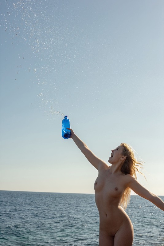 Лишившись трусиков и майки, светловолосая милашка начинает эротично позировать голышом у моря, располагаясь на камнях и меняя разные ракурсы. Раздвинув промежность, девушка с маленькой грудью без всякой скромности показала бритую письку с возбуждающими половыми губами, а прогнувшись раком, она оттопыривала попку.