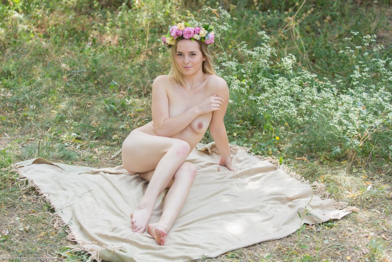 Распутная девка с обнажённым телом, отыскав укромное место на природе, начинает эротично позировать и снимать короткое платье, под которым не было трусов и другого нижнего белья. В будущем, лежа на подстилке, молодая красотка подробно показала маленькие сиськи и бритую письку с гладким лобком.