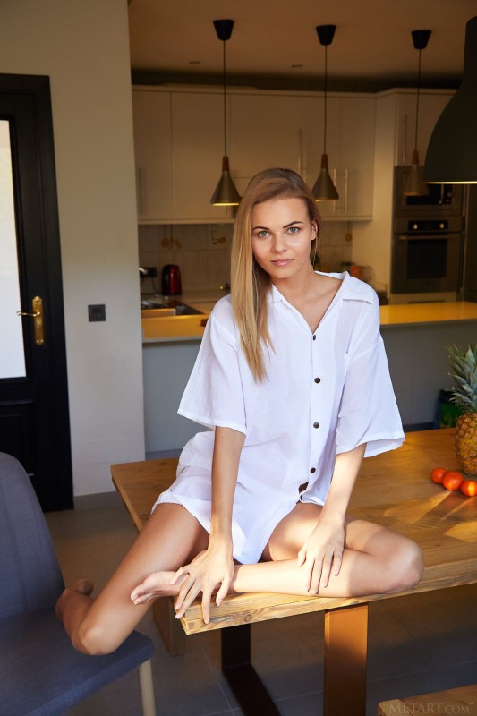 Скинув с себя рубашку и расположившись на кухонном столе, молодая домохозяйка с милой улыбкой позволяет себе откровенно позировать и хвастать перед нами красивой фигурой. Меняя ракурсы и страстно пошлепывая ягодицы рукой, стройняшка с маленькими сиськами больше всего показывала нам бритую письку с возбуждающей щёлкой.