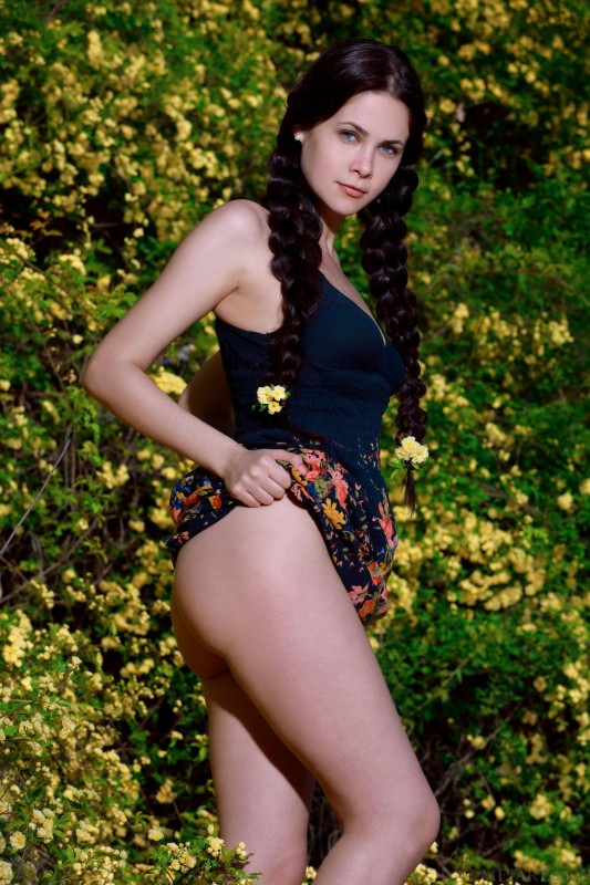 Отыскав уединённое местечко на природе в густых кустах, привлекательная брюнетка с косичками медленно обнажает своё аппетитное тело и наслаждаясь летним днем чередует наиболее возбуждающие позы, в том числе вставая раком. Располагаясь на подстилке, сексуальная девушка с упругими буферами даёт нам шанс взглянуть на её бритую письку и сочную задницу, поглаживая ягодицы руками.