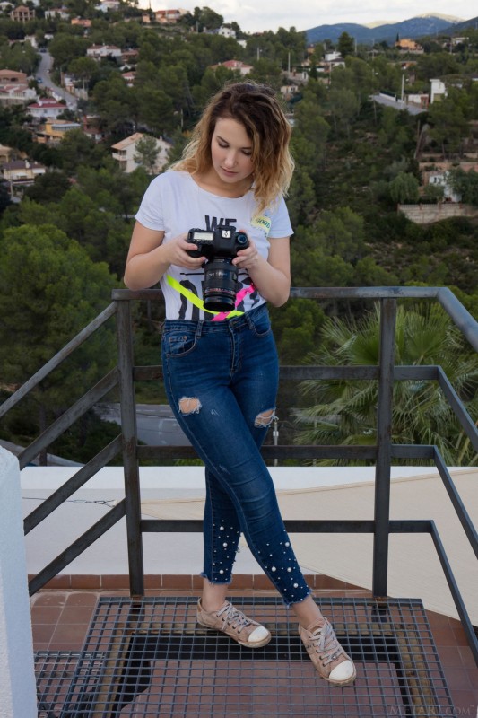 Делая снимки города, привлекательная девушка в джинсах в будущем медленно оголяется и демонстрирует большую жопу и нежно трогает себя руками. Обнаженной сексуальная молодая красотка с упругими заведенными сиськами так же не забывала засвечивать бритую письку и лобок.