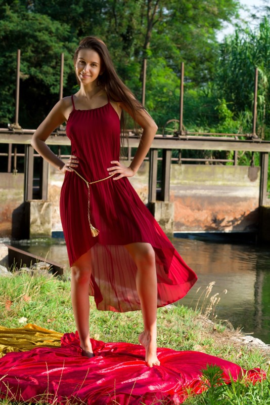 Отыскав уединённое и живописное местечко возле небольшой дамбы, сексуальная девушка с худенькой талией и безумно красивой грудью позирует в длинном платье, а вскоре все же раздевается до гола. Обнаженной, красотка с натуральными упругими сиськами ложится на расстеленное на траве покрывало и демонстрирует нам бритую письку с гладеньким лобком.