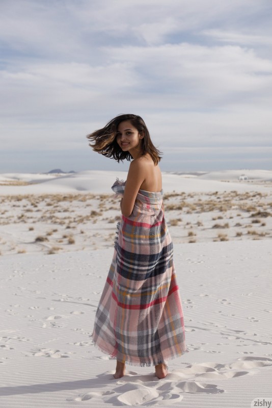 Улыбаясь и строя глазки, привлекательная девушка с сочной жопой, порой прикрываясь пледом, эротично позируя на песке. Ощущая от происходящего удовольствие, сексуальная красотка с весьма упругими сиськами и немного заведенными сосочками засвечивала бритую письку и гладкий лобок.