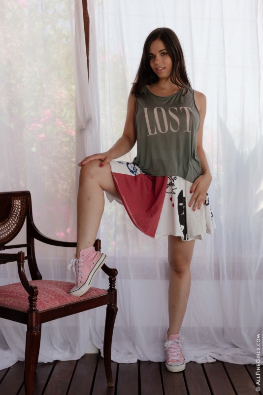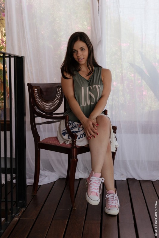 Скромная молодая красавица с довольно пышными формами, будучи одета в юбку с майкой и кеды, очаровательно позирует для нас, а в какой-то момент все же раздевается до гола. Обнаженной сексуальная девушка с большими сиськами устраивается на стуле и засвечивает крупные ягодицы и гладко выбритую письку.