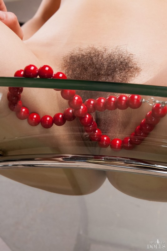 Устроившись на журнальном стеклянном столике, совершенно голая девушка с вьющимися густыми волосами и красивой натуральной грудью раздвигает промежность, что бы показать нам свою желанную письку с волосатым лобком. Во время съёмки, красотка игралась с бусами и нежно проводила ими по гладеньким половым губкам.