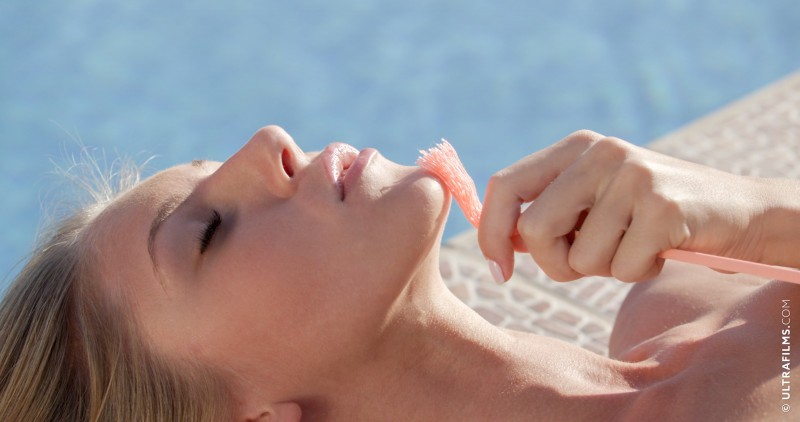 Медленно лишившись купальника, сексуальная и весьма худая блондинка с плоской грудью в дальнейшем намочила в бассейне сладенькую бритую письку с гладким лобком. Загорая в будущем на полотенце, заведенная девушка так же засвечивала промежность крупным планом.