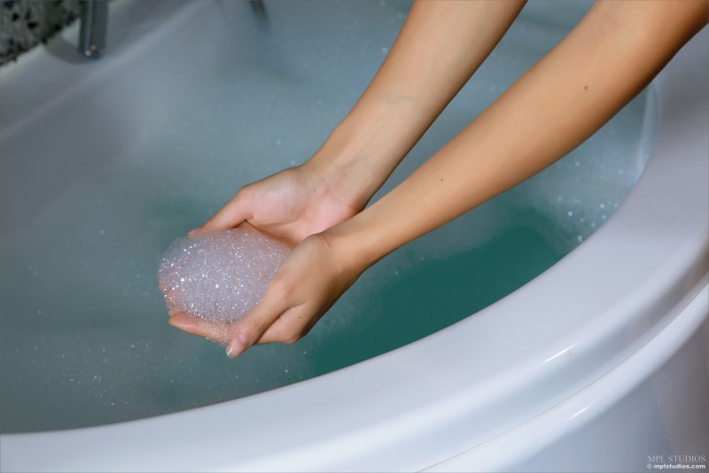 После вечеринки молодая брюнетка сняла с себя блестящее платье и голая показала свое худое тело с маленькой грудью с большими сосками в ванной комнате. Решив принять ванну с мягкой пеной, обнаженная девица красиво нагибается к ней, засвечивая свой бритый гладкий лобок и нежную сочную киску.