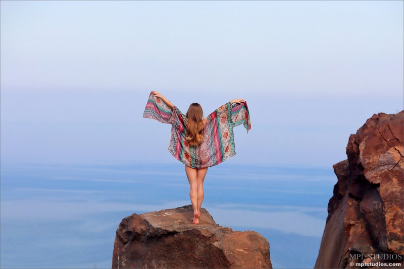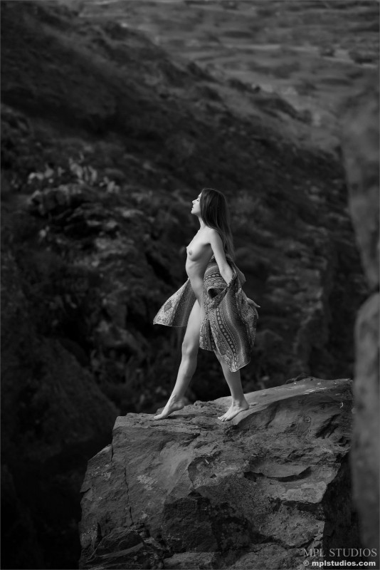 Вооружившись только легким платком, обнаженная девушка эротично позирует на горе, красиво выгибаясь всем свои стройным изящным телом на голых камнях. Молодая красавица позволяет сколько угодно смотреть на ее маленькие упругие сиськи и округлые нежные бедра, что скрывают бритую розовую киску.