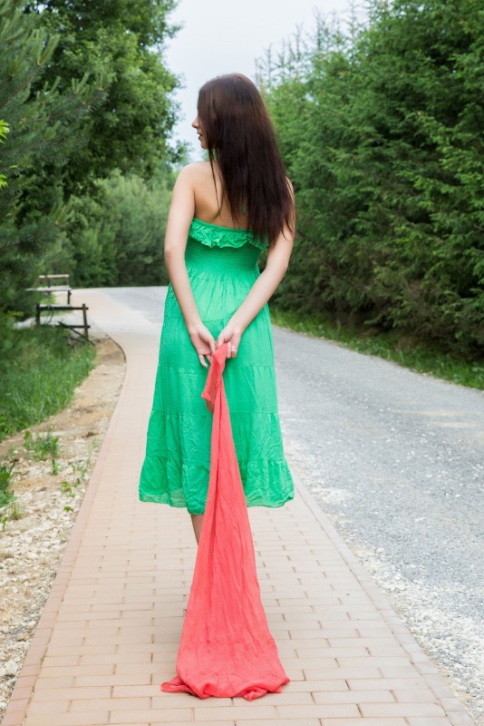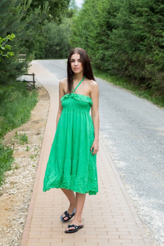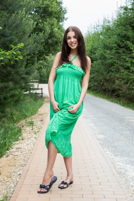 Молодая извращенка в зеленом платье без трусов с радостью разделась на дороге, поднимая юбку и показывая всем прохожим свою сочную красивую киску. Бесстыжая девица с большими упругими сиськами лежит на тротуаре и с раздвинутыми ногами вовсю позирует на камеру.