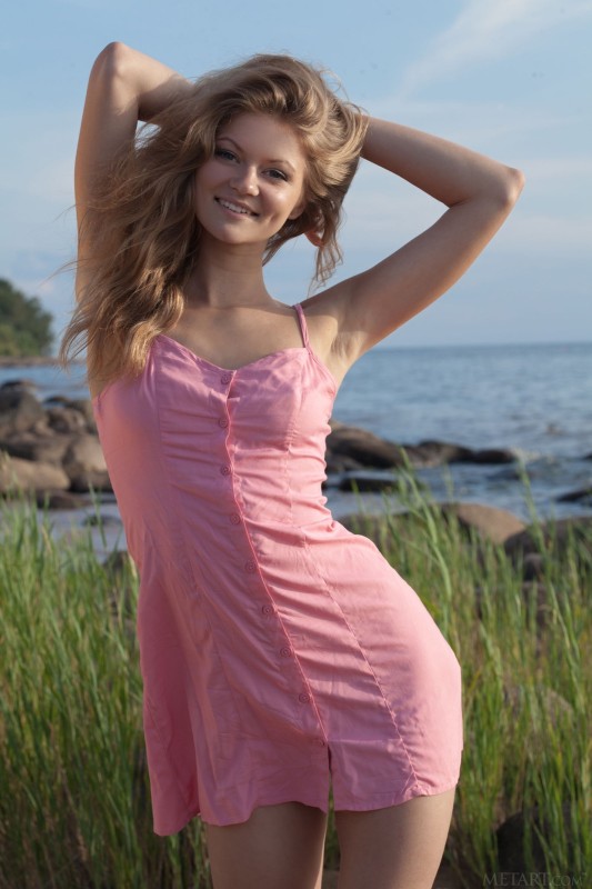 Очаровательная молодая детка в коротком розовом платье медленно и игриво разделась до гола на природе, наслаждаясь свежим ветерком, ласкающим ее стройное обнаженное тело. Голая красавица с маленькими сиськами не стесняется камеру и откровенно показывает нам свою бритую аккуратную киску.