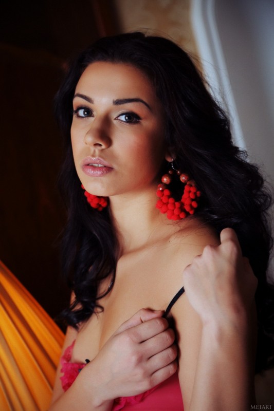 Страстно сорвав с себя красивое красное белье, голая жгучая брюнетка с маленькими сиськами эротично позирует на большой кровати. Сексуальная красотка с упругой аппетитной попкой чувственно поглаживает свое стройное горячее тело, медленно спускаясь ласками к бритой темной киске.