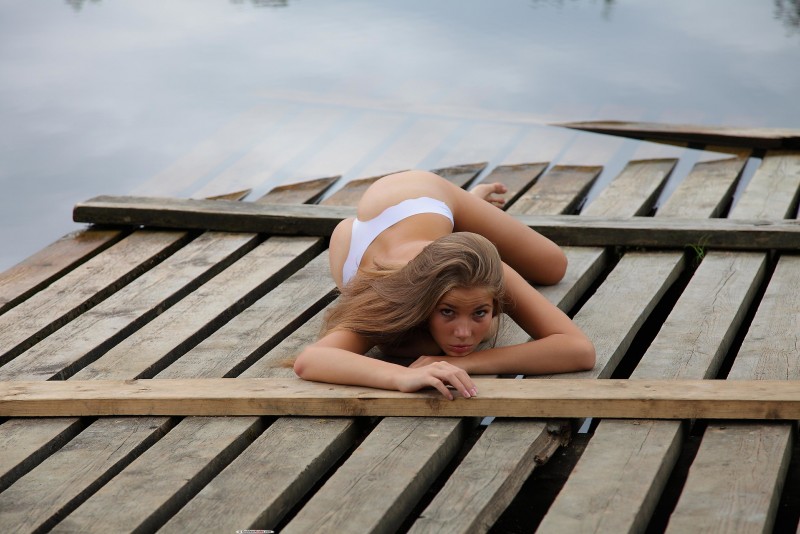 Медленно сняв с себя летнее платье, молодая шатенка с красивой упругой попкой резвится на озере, лежа на пирсе. Бесстыжая девица со стройным соблазнительным телом игриво снимает с себя белые трусики и позирует перед камерой, откровенно показывая всем натуральные титьки.