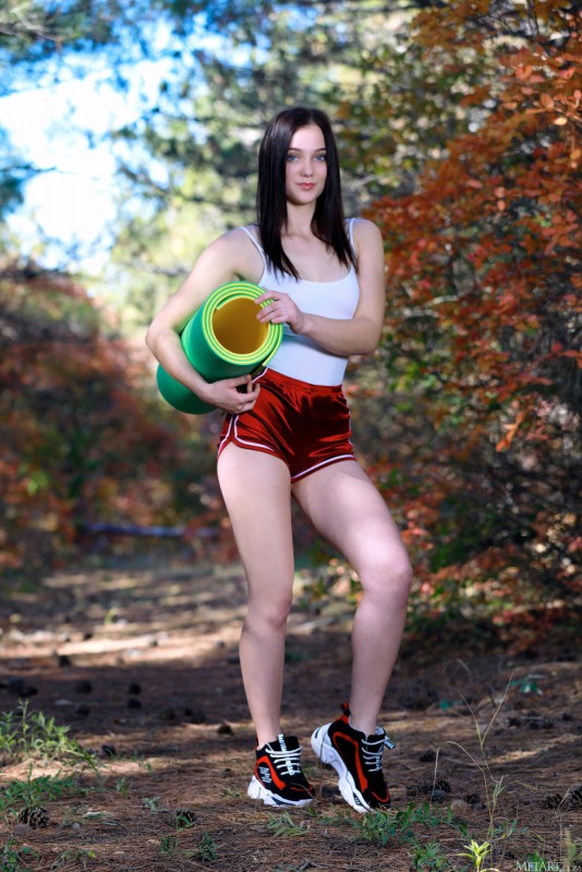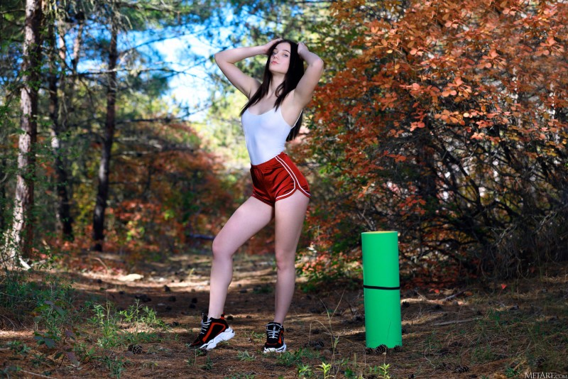 Захватив с собой коврик, молодая подтянутая спортсменка с удовольствием скидывает с себя форму и тренируется полностью обнаженной в осеннем лесу. Нежная брюнетка с натуральными красивыми сиськами усердно выполняет разные упражнения на коврике, в необычных позах засвечивая перед камерой свою сочную задницу и бритую письку.