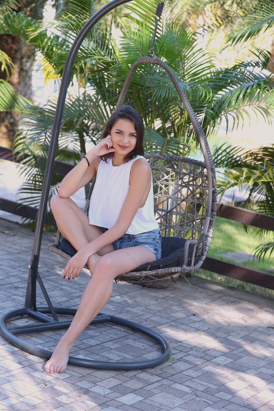 Расслабленно отдыхая на заднем дворе дома, развратная брюнетка в коротких джинсовых шортах с удовольствием сняла с себя всю одежду и оголила перед камерой аппетитную упругую попку. Сексуальная девушка с красивыми натуральными сиськами не стесняется показать себя во всей красе и с разных ракурсов засвечивает свою бритую сочную пизду.
