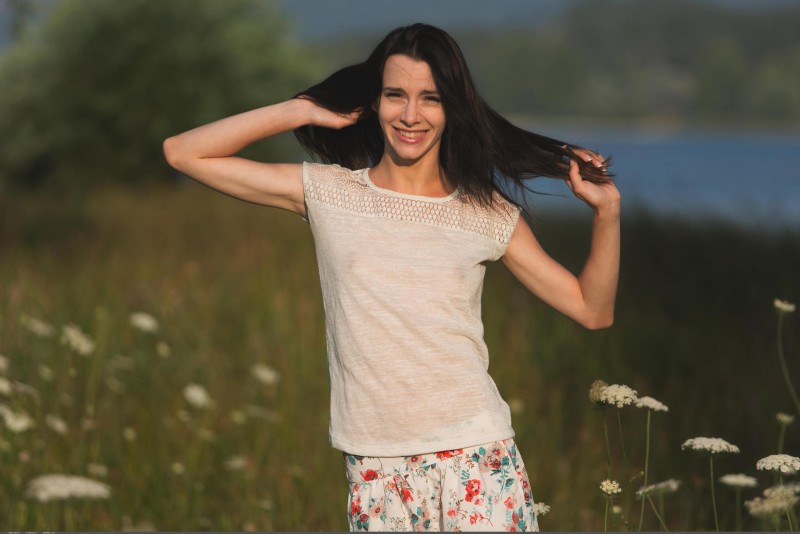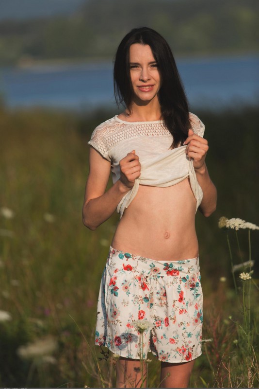 Медленно снимая с себя всю одежду, молодая брюнетка расслабленно гуляет абсолютно голая на природе, светя своими миниатюрными прелестями. Бесстыжая девушка с маленькими титьками откровенно принимает разные возбуждающие позы и развратно показывает на камеру свою аппетитную попку и бритую нежную письку.