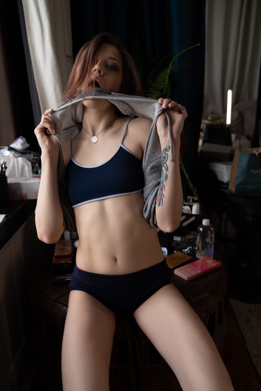 Игривая молодая детка эротично сняла с себя кофту и нижнее белье и соблазнительно засветила мельком свою бритую нежную киску. Обнаженная девица скромно прикрывает руками свои маленькие титьки с острыми проколотыми сосками, позволяя любоваться ими только тогда, когда она этого захочет.