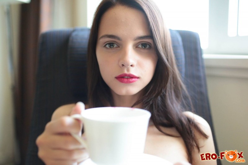 Очаровательная голая худышка с ярко красной помадой на губах пьёт чай в кресле. Вскоре брюнетка убирает кружку в сторону и полностью отдаётся во власть фотографа и принимая самые откровенные позы показывает нам своё упругое, юное тело.