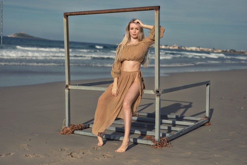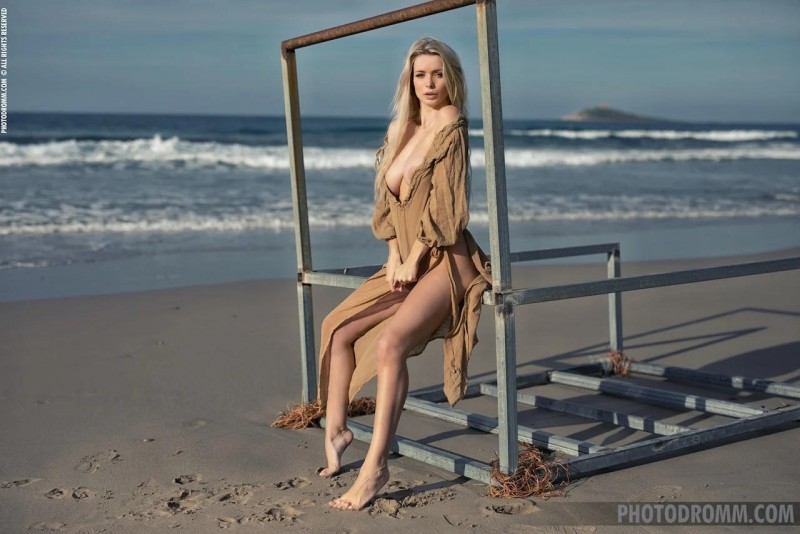 Расслабленно отдыхая на пустом пляже, сексуальная русская красотка с большой сочной грудью медленно сняла с себя легкое платье. Эротично позируя на горячем песке, обнаженная блондинка с шикарным телом соблазнительно виляет стройными бедрами и аппетитной круглой попкой.