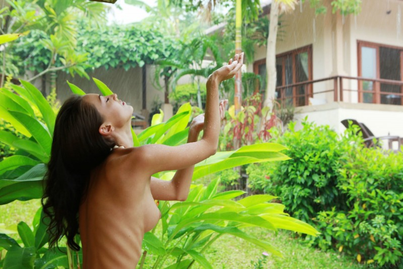 Наслаждаясь теплым дождем, худая телка с голыми упругими титьками сняла с себя длинную промокшую юбку, оголив на камеру свою красивую аппетитную попку. Затем голая брюнетка принялась соблазнительно позировать всем своим мокрым худощавым телом, открыто демонстрируя с разных ракурсов бритую аккуратную киску.