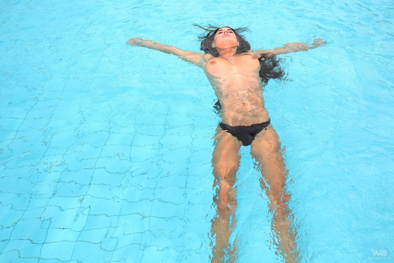Вдоволь наплававшись в прохладном бассейне, горячая мокрая брюнетка с сексуальным телом чувственно позирует перед камерой в одних лишь трусиках. Вовсю светя своими большими сочными буферами, развратная баба возбуждающе выпячивает свою красивую упругую задницу и, сдвинув в сторону трусы, показала бритую сочную пизду со стрижкой на лобке.