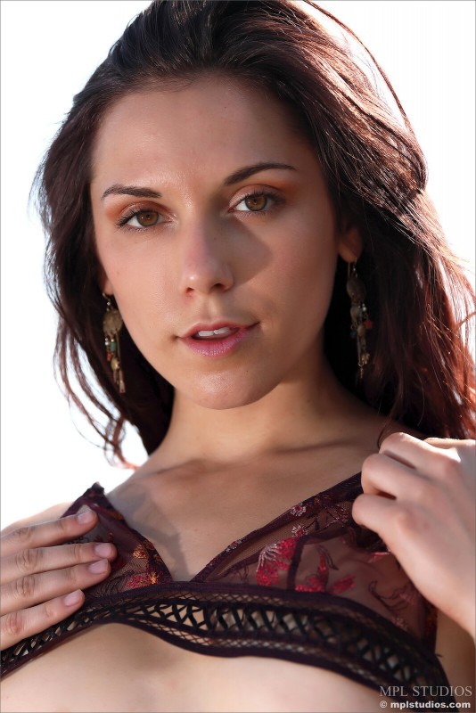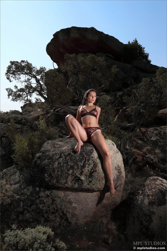 Постепенно сняв с себя кружевное нижнее белье, страстная брюнетка возбуждающе засветила на камеру свой подстриженный волосатый лобок. Чувственно изгибаясь всем телом на фоне природы, обнаженная девица с миниатюрными титьками расслабленно лежит на больших скалах, мельком засвечивая сочные прелести.