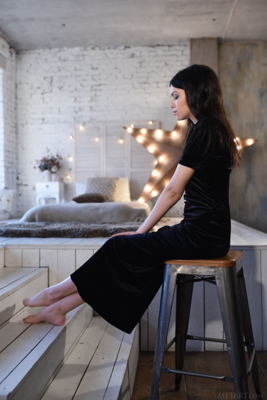 Стройная нежная девица медленно сняла с себя платье без нижнего белья и, сидя на стуле перед камерой, широко раздвинула свои длинные ножки. Развратно раскрыв свою голую бритую промежность, брюнетка с натуральными титьками в разных позах и с разных ракурсов приняла демонстрировать всем свою бритую пухлую письку.
