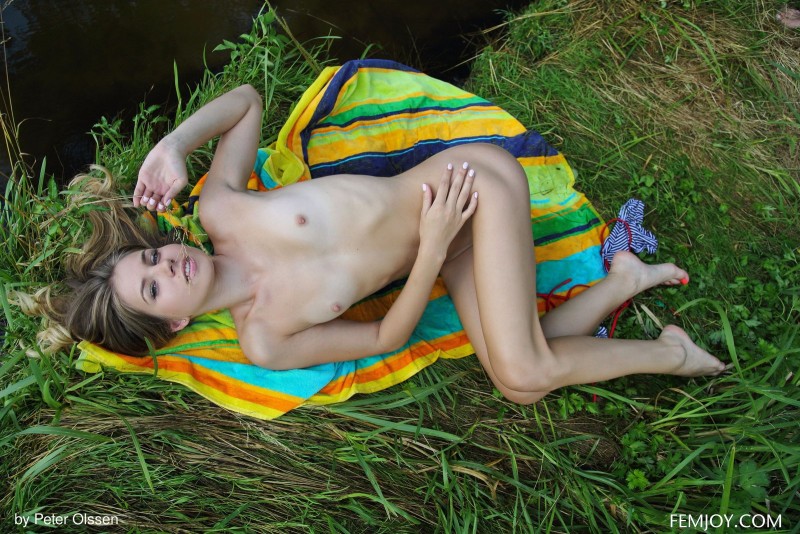 с себя бикини и удобно устроилась на берегу реки. Лежа голышом перед камерой, нежная красавица с плоской грудью с разных эротичных позах извивается всем телом, раскрывая и развратно подставляя как можно ближе свою гладкую розовую киску.