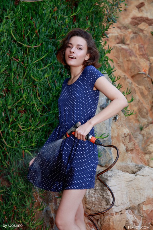 Тщательно полив из шланга свой сад, уставшая девица в мокром коротком платье бесстыже оголила перед камерой свою красивую упругую попку и принялась развратно вилять ею в разных откровенных позах, соблазнительно подставляя крупным планом бритую розовую пизду.