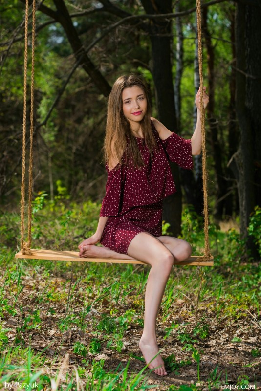 Игриво качаясь на качелях, молодая грудастая девушка медленно сняла с себя платье на природе, полностью оголив свое стройное фигуристое тело. Сексуальная девица с большими натуральными сиськами, активно демонстрирует нам свои сочные возбуждающие прелести и даже раскрывает свою бритую на всё готовую письку.