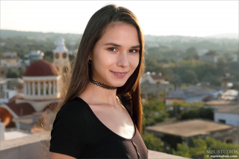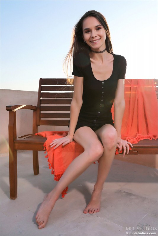 Развратно позируя на крыше дома, длинноногая худая девушка с маленькой упругой попкой постепенно снимает с себя короткое обтягивающее платье без белья. Полностью оголив свое нежное молодое тело, обнаженная брюнетка с аккуратными упругими титечками похотливо подставляет как можно ближе бритую пухлую киску с узкой сладкой щелкой.