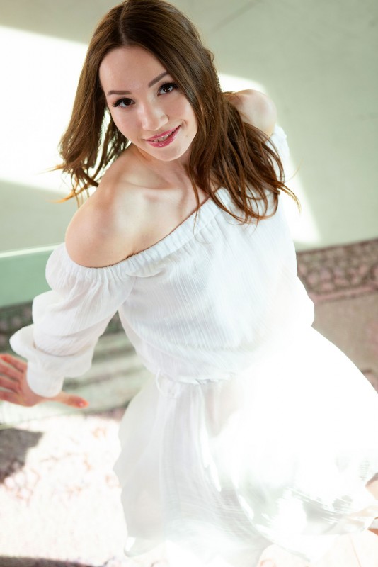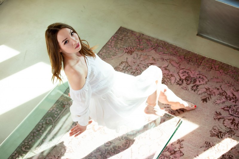 Медленно стягивая с себя короткое платьице и милые трусишки, соблазнительная девушка эротично разделась до гола на стеклянном столе. Красиво изгибаясь в спинке, обнаженная кокетка с маленькими титьками в разных позах демонстрирует нам свои возбуждающие прелести, а затем развратно встает раком, крупным планом выпятив свою упругую жопу с бритой писькой и узким анусом.
