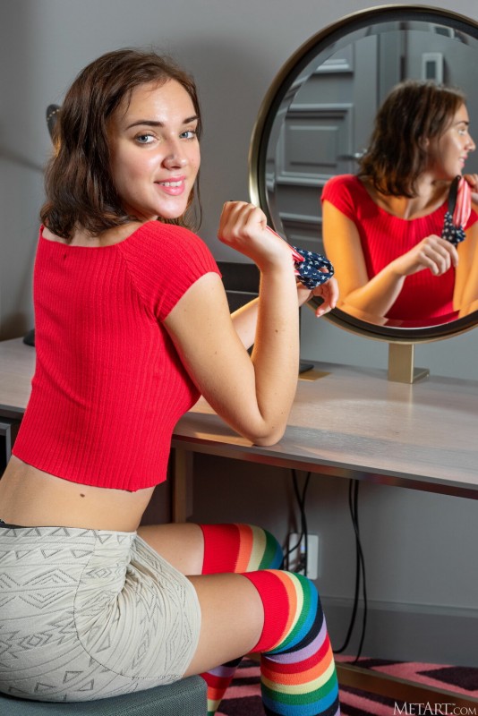 Эротика » Голые девушки » Кокетка в полосатых гольфах раздвинула ноги