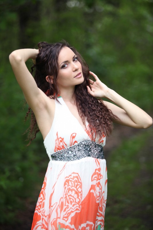 Возбуждающе медленно сняв перед камерой легкое летнее платье, кудрявая дамочка с голыми упругими сиськами весело проводит время в лесу. Голая брюнетка специально выпячивает в разных позах свои аппетитные прелести, мельком засвечивая даже гладкую маленькую писю.