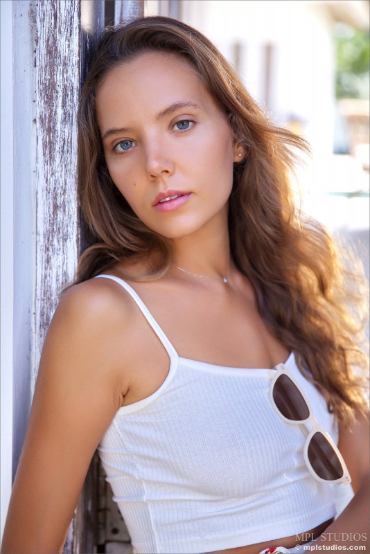 На летнем отдыхе изящная стройная леди в шляпке и легкой одежде медленно сняла с себя короткую майку и полностью оголила красивую упругую грудь. Чувственно выгибаясь в спине, загорелая сексуальная девушка горячо выпячивает красивую подтянутую попочку и даже мельком засвечивает бритую киску.