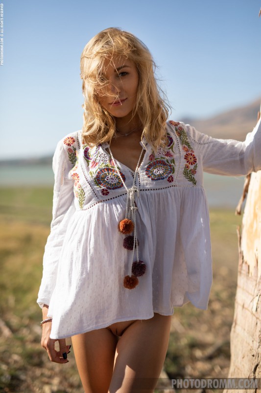 Гуляя на природе и наслаждаясь теплым ласковым ветерком, молодая русская красавица в рубашке без трусов соблазнительно смотрит прямо на камеру и медленно раздевается до гола. Демонстрируя нам свое шикарное фигуристое тело, сексуальная блондинка с сочными упругими буферами развратно виляет своей сочной жопкой и мельком засвечивает гладкую писечку.