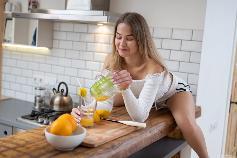 Закончив со своим завтраком, молодая бесстыжая девка возбуждающе медленно стянула с себя одежду и полностью оголила перед камерой свое стройное тело прямо на кухне. Затем голая девица с натуральными упругими сиськами резво забралась на столешницу и, развратно задирая и раздвигая ноги, во всей красе показала нам свою бритую нежную киску.