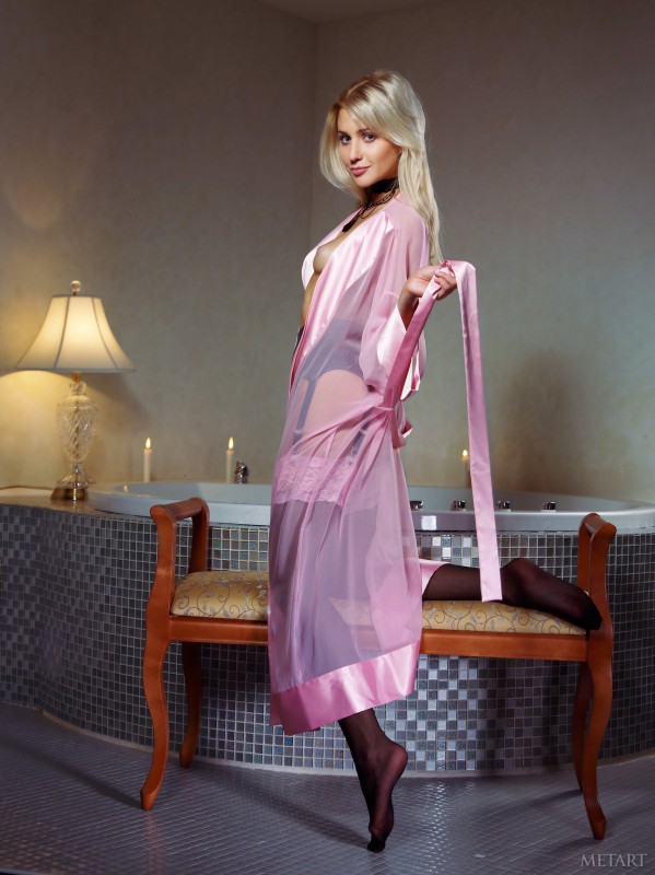 Эротично позируя в большой ванной комнате, дерзкая гламурная сучка в черных чулках соблазнительно медленно снимает с себя прозрачный розовый халатик и выставляет на показ перед камерой свое стройное гибкое тело с миниатюрными сиськами и подстриженной волосатой писечкой.
