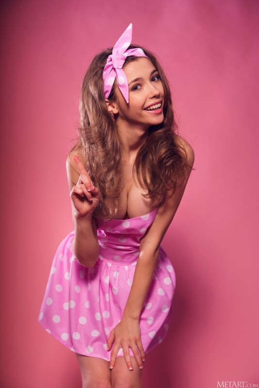 Игриво кривляясь перед камерой в разных позах, молоденькая гламурная фифа в коротком розовом платье бесстыже оголила большие натуральные буфера и, медленно стянув прозрачные трусики, выставила на показ аппетитную упругую попу с гладким бритым лобком.