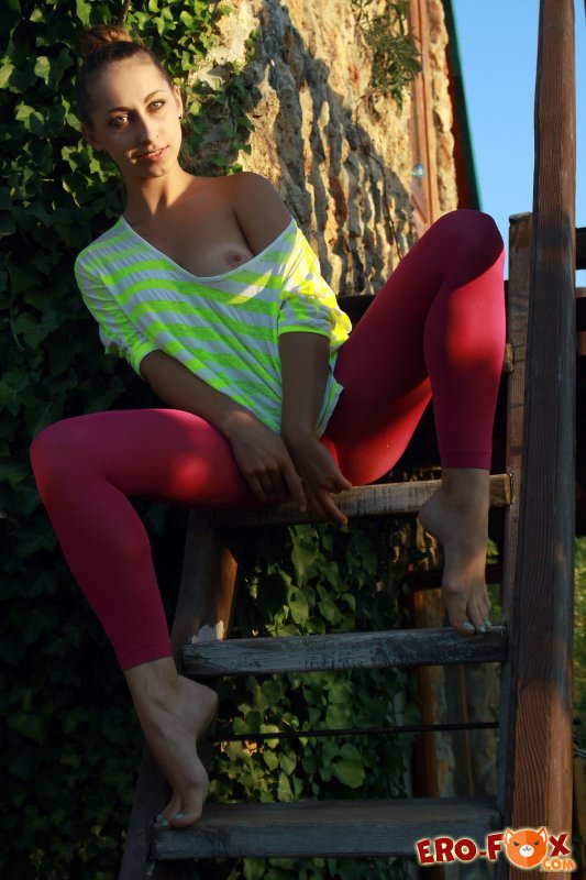 Озорная девушка разделась на высокой деревянной лестнице, демонстрируя своё упругое тело перед фото камерой. Красотка с подтянутыми титьками и сочной попкой полностью скинула с себя одежду и голая в откровенных позах позволила нам взглянуть на неё в чём мать родила.