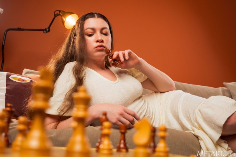 Проиграв партию в шахматы и тут же начав исполняв перед нами настоящий стриптиз, сексуальная детка безумно возбуждающе снимает с себя всю одежду и, выставив на показ свое шикарное тело с сочными буферами, приглашающе раздвигает на диване красивые длинные ноги с милой розовой киской между ними.