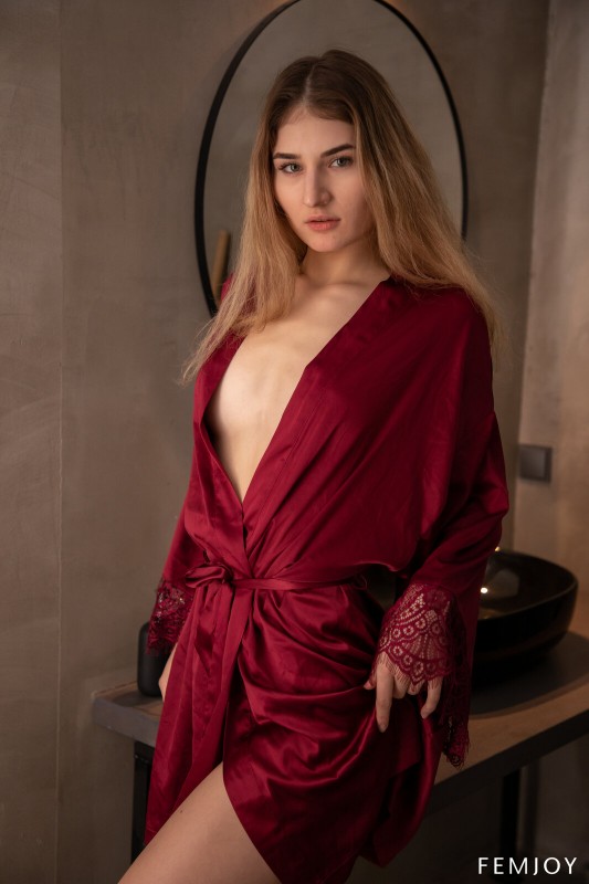 Совершенно не стесняясь фотографирующей ее камеры, дерзкая телка в красном эротичном халате возбуждающе медленно оголяет под ним свое стройное тело с упругими титьками и, охотно раскрываясь перед нами в разных позах, вовсю светит между ног бритой манящей пиздёнкой.