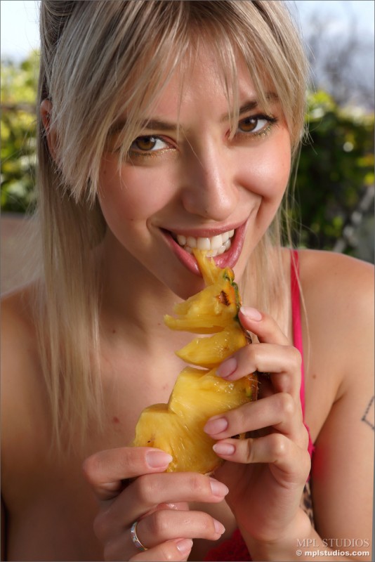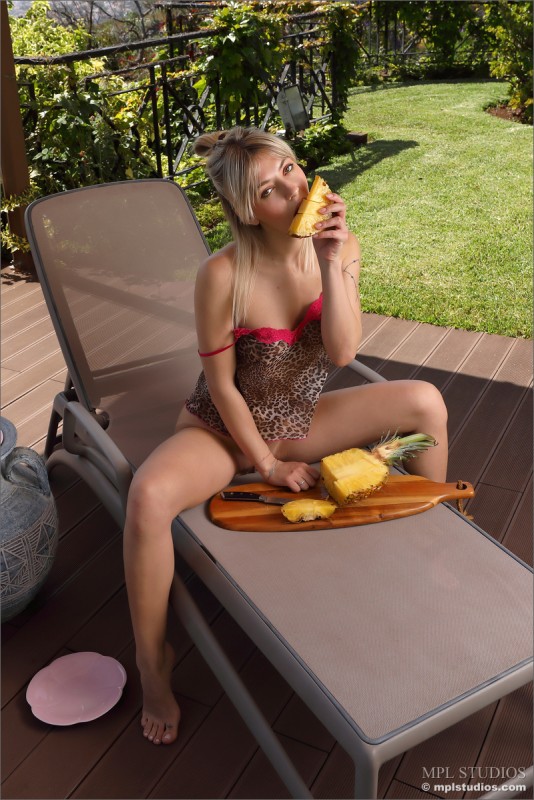 Выставив на показ свои аккуратные упругие титечки и эротично обливаясь соком спелого ананаса, горячая сладкая чертовка лежит перед камерой на шезлонге и, без стеснения раскрывая для нас свои стройные красивые ножки, безумно возбуждающе светит в промежности мокрой бритой киской.