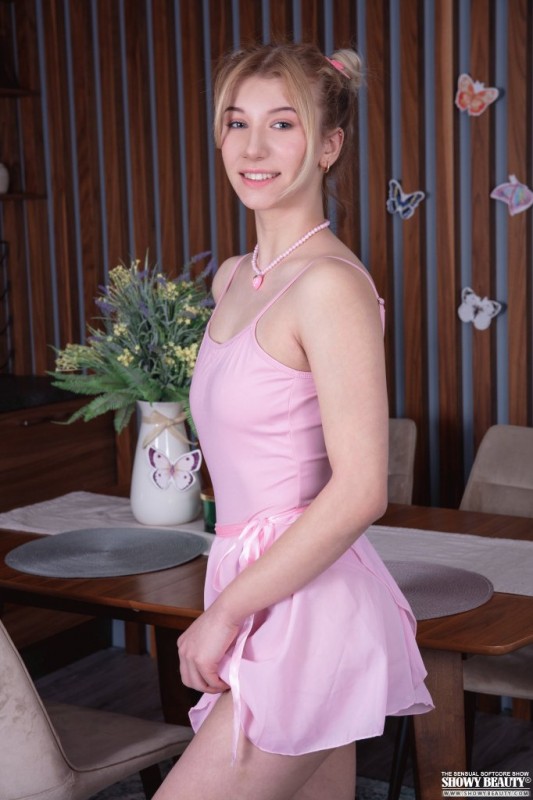Изящно двигаясь перед зрителями, молодая гибкая балерина в розовом костюмчике раздевается до гола и позирует без стеснения на камеру, игриво выпячивая вперед свою нежную упругую попку и широко раскрывая на столе бритую промежность с сочной соблазнительной писькой.