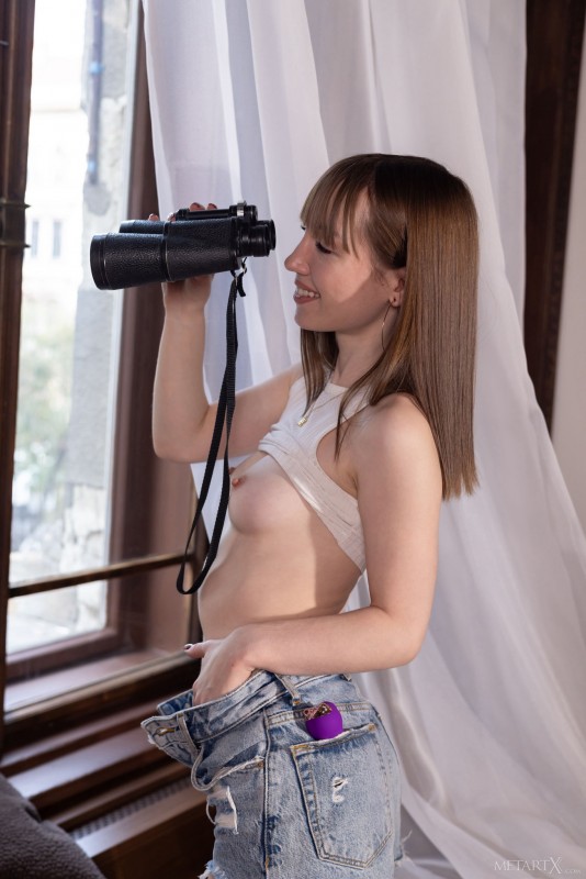 Внимательно смотря в бинокль и постепенно раздеваясь перед камерой до гола, молодая извращенка с упругими титьками бесстыже подглядывает за всеми в окно и, рассевшись на подоконнике с широко раскрытой рогаткой, без остановки дрочит свою бритую розовую письку вибратором.
