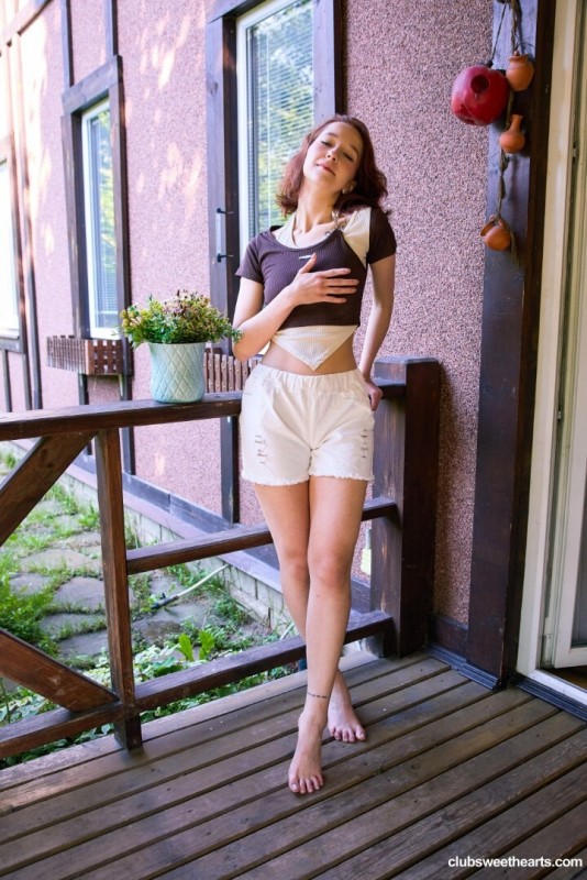 Эротично снимая с себя всю одежду на террасе, миниатюрная шатенка с плоскими титьками и коричневыми сосками оголила между ног свой сочный губастый вареник и, развратно кувыркаясь на лавочке в разных позах, раскрывает перед камерой свои самые интимные местечки.