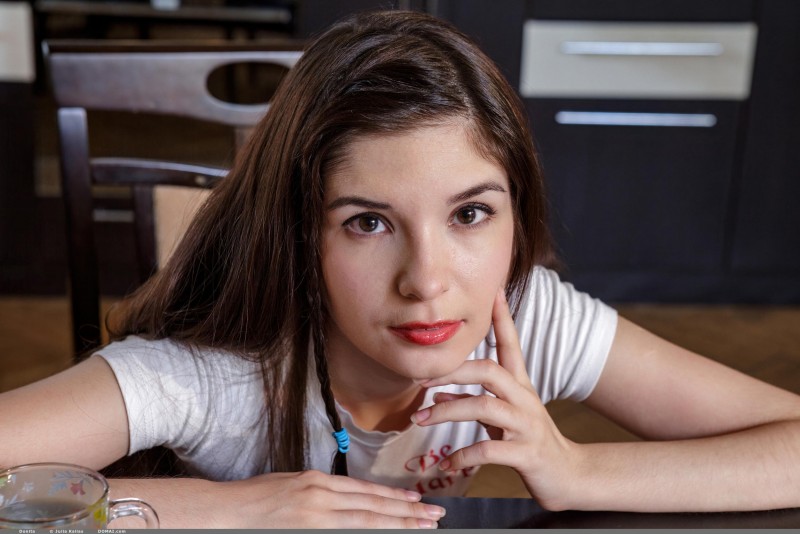 Кокетливо оголив под футболкой свои миниатюрные титечки, развратная стройная девица в трусиках соблазнительно извивается всем телом в разных позах перед камерой и, медленно стянув с трусы с упругой попочки, показала заросшую мохнатку на лобке с розовой сочной писькой под ней.