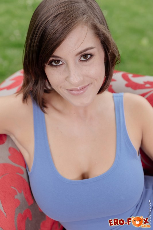 Симпатичная девушка в платье на голое тело, со стройной фигурой и висячей грудью большого размера, расположившись на диване стоящем на газоне, принялась медленно оголятся, стягивая платье. Полностью раздевшись, голая красавица чередует эротичные позы, соблазнительно красуясь перед камерой и демонстрируя нам бритую киску, упругую попку и большие сиськи, которые так и хочется пощупать.