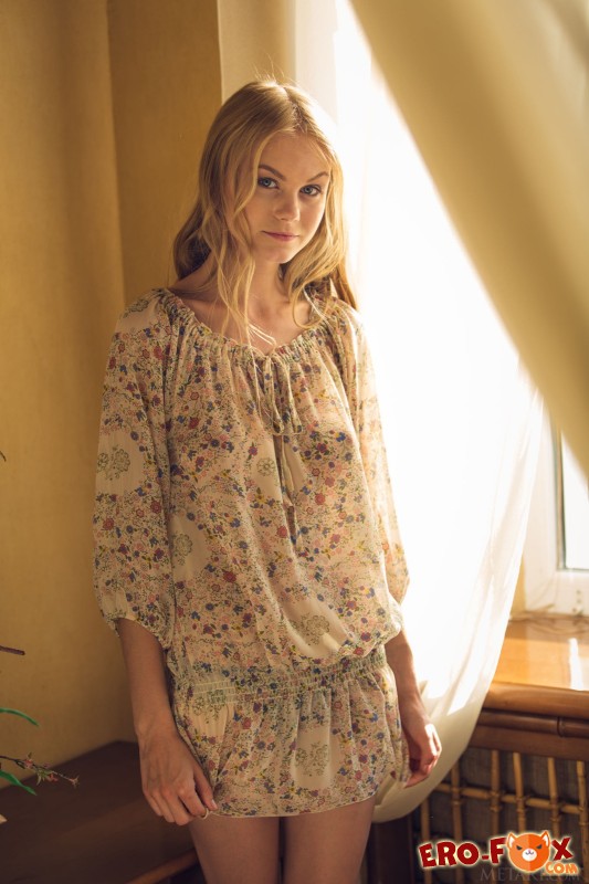 Медленно и максимально эротично сексапильная модель стягивает платье, после чего нагая позирует у окна, стараясь показывать красивое тело с каждой стороны. Для начала милашка с упругими дойками поворачивается попочкой, а после располагается на подоконнике и раздвигает промежность, засвечивая бритую киску и нежно трогая вьющиеся волосы руками.
